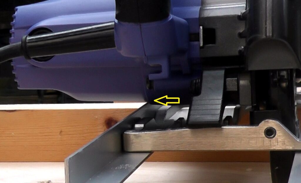 丸ノコの刃を50mm以上出してスライドさせると、写真の矢印の部分で丸ノコ本体とアルミアングルが干渉してしまうことが分かりました。