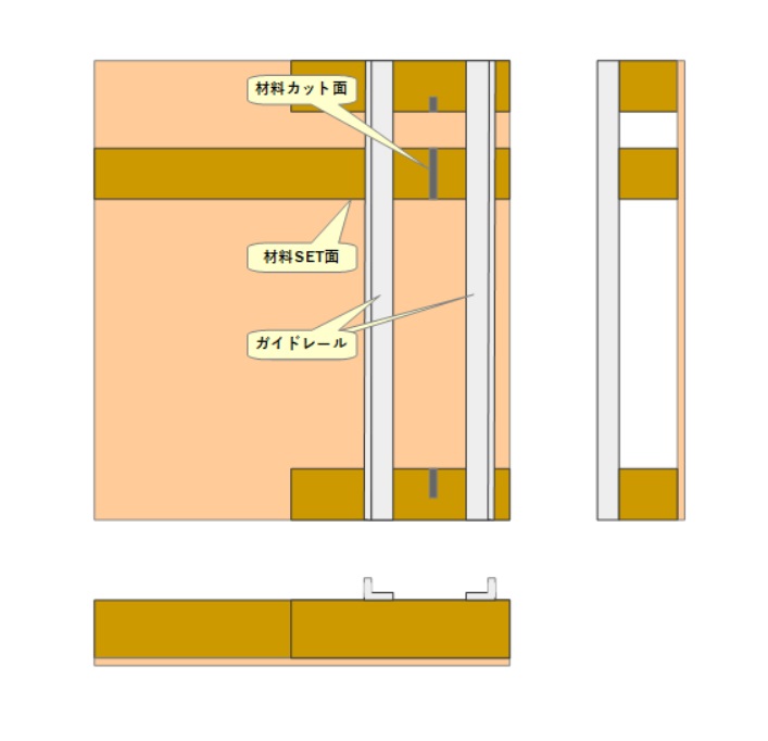 構造としては、べニアなどの板上に、ある程度の厚みのある木材(カットしたい木材よりも厚い木材)を水平に固定し、そこに2本のガイドレールを垂直に固定するというものです。