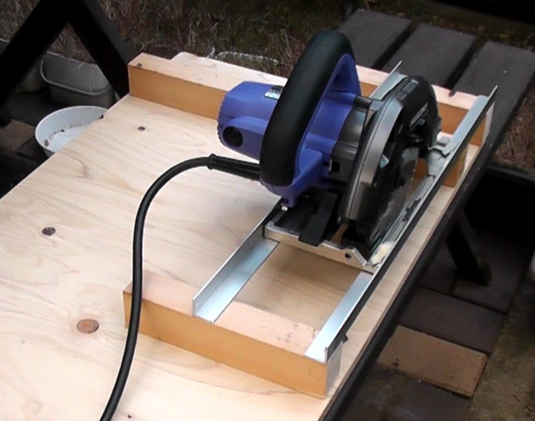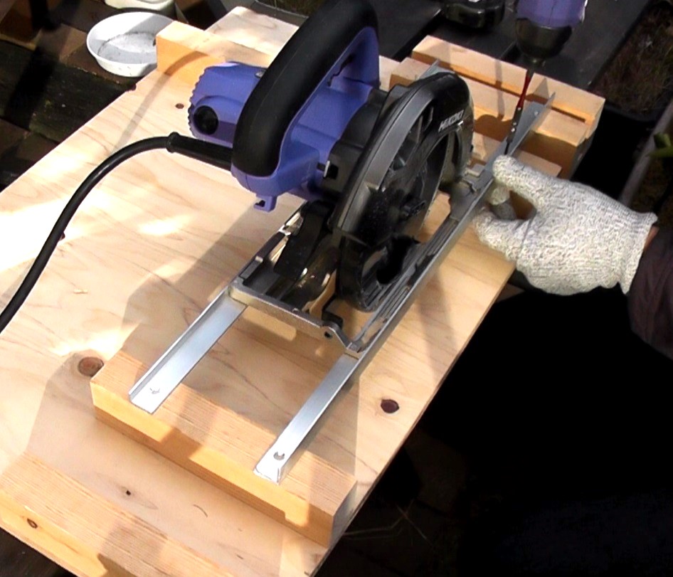 そこで、多くのDIY師は、通常の丸ノコをスライド丸ノコ化する治具を作成して対応しています。