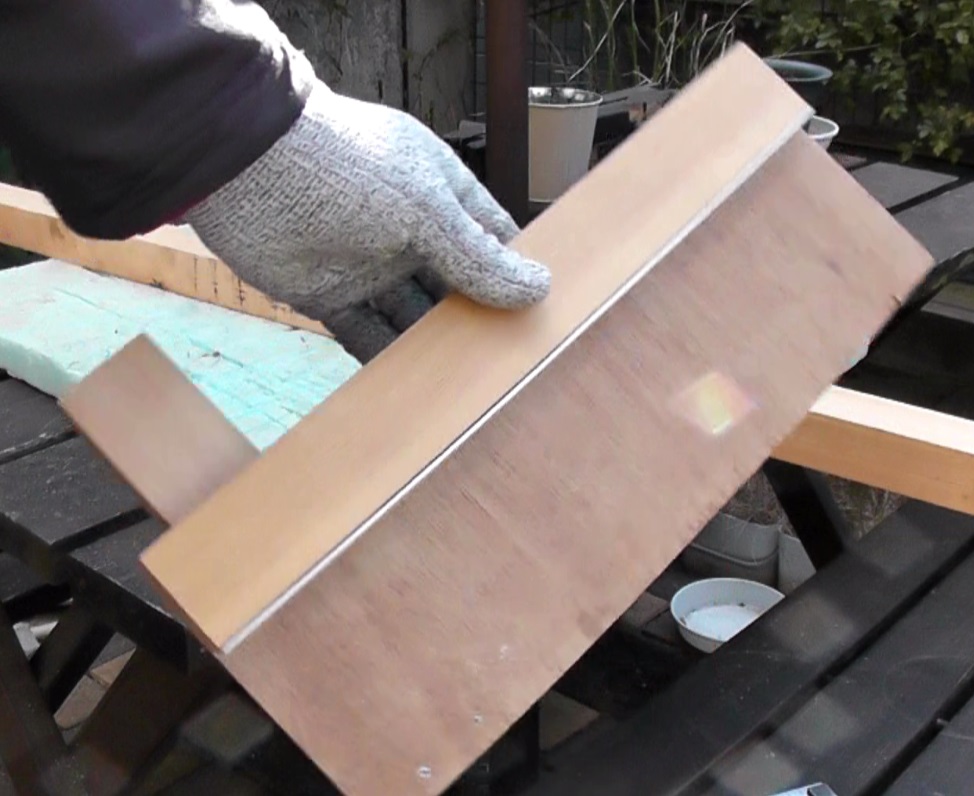 構成としては、べニア板に薄い木材を2枚貼り付けただけの簡単な治具ですが、2枚の木材をしっかり垂直に固定することにより、市販の丸ノコ定規と同等の精度で材料をカットすることが出来ます。(垂直の調整にはかなり苦労しましたが、かなり精度の高い治具を作成することが出来ました)