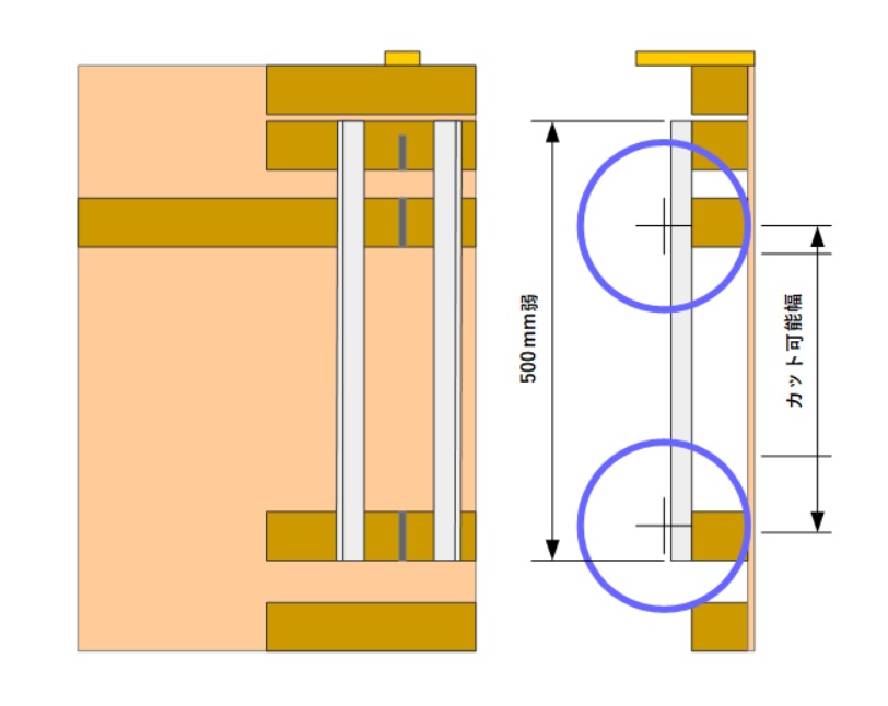 そこで今回は、既に購入してしまった500mm弱のアルミアングルをベースに、元々の設計から少々変更を加えて対応します。