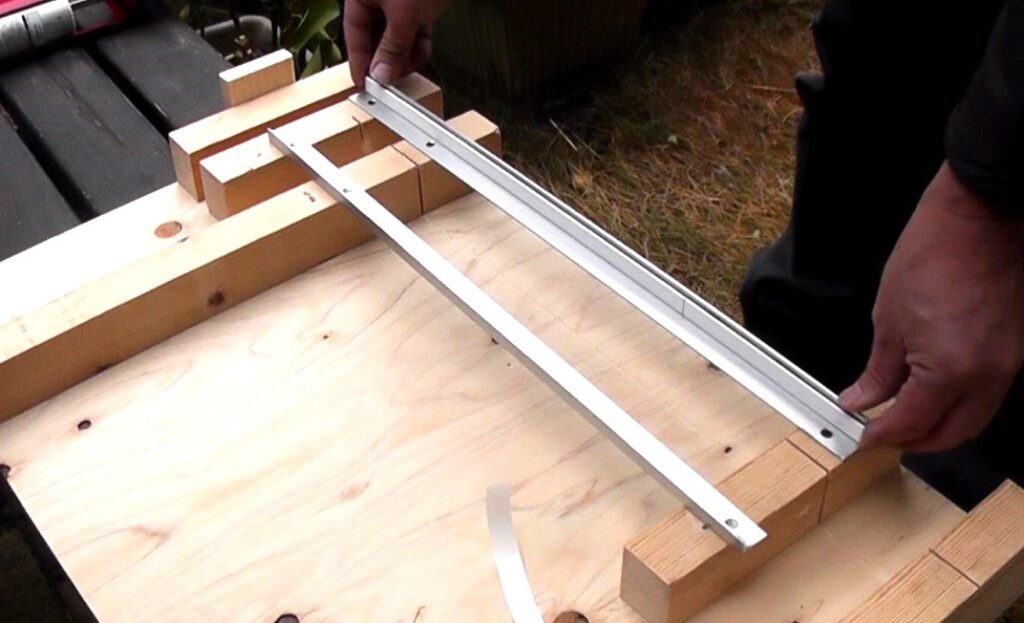 両側のアルミアングルに樹脂レールを貼り付けたら、丸ノコを仮置きして、ガタがなくなるようアルミアングルを固定し直します。(樹脂レールの厚み分だけアルミアングル間の距離を広げる必要があります)