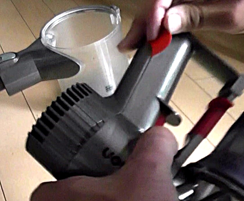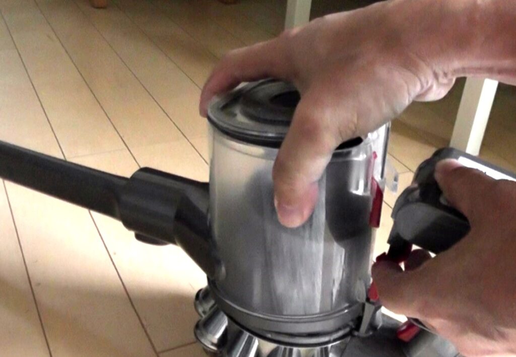 続いて、吸い取ったゴミが溜める部分のユニット(以下、サイクロンユニット)を本体から丸ごと取り外して、本体のモータが空気を吸い込む部分の清掃を行っていきます。