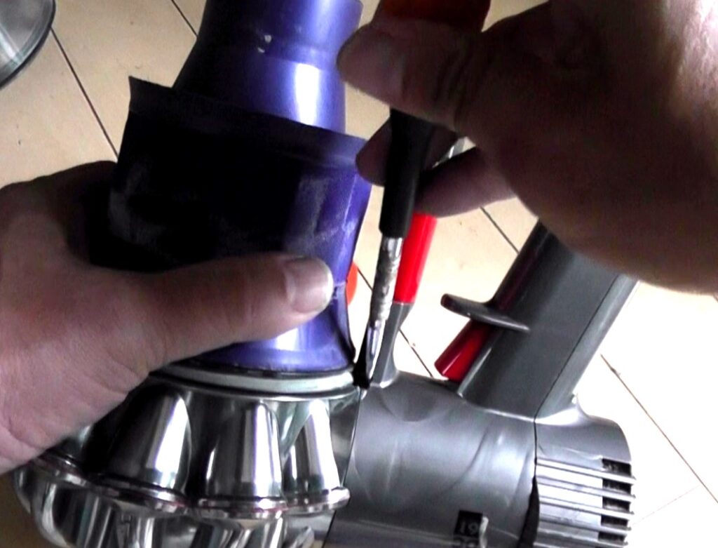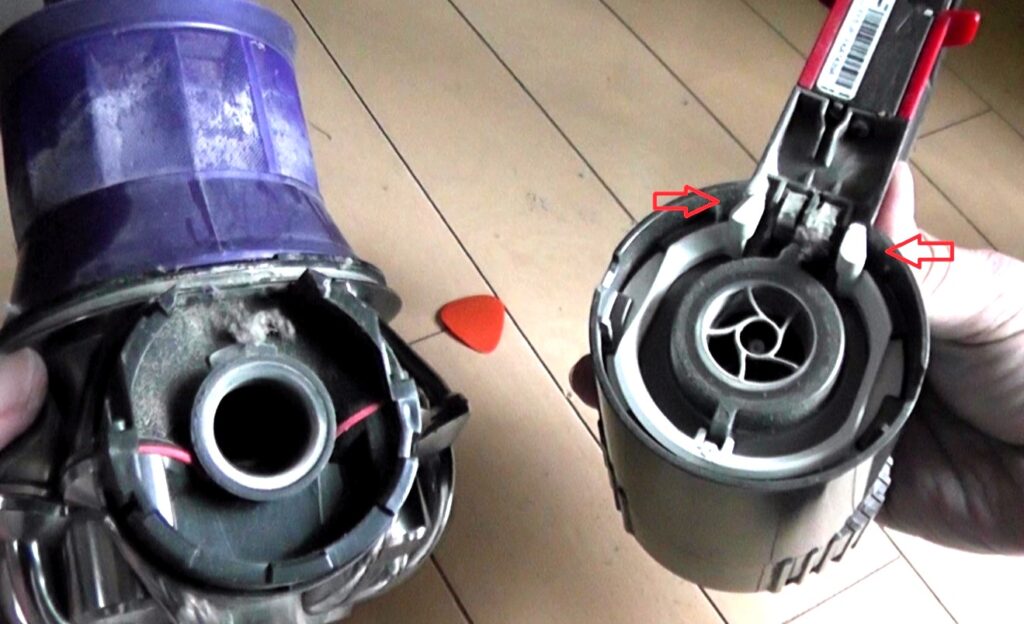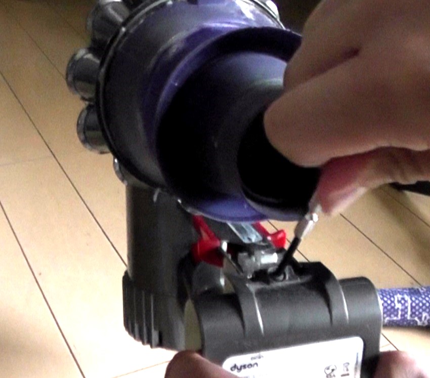モータが格納されている本体部分と、サイクロンユニットは、写真にてマイナスドライバーを挿している箇所でツメ嵌合されています。(固定しているネジなどはありません)