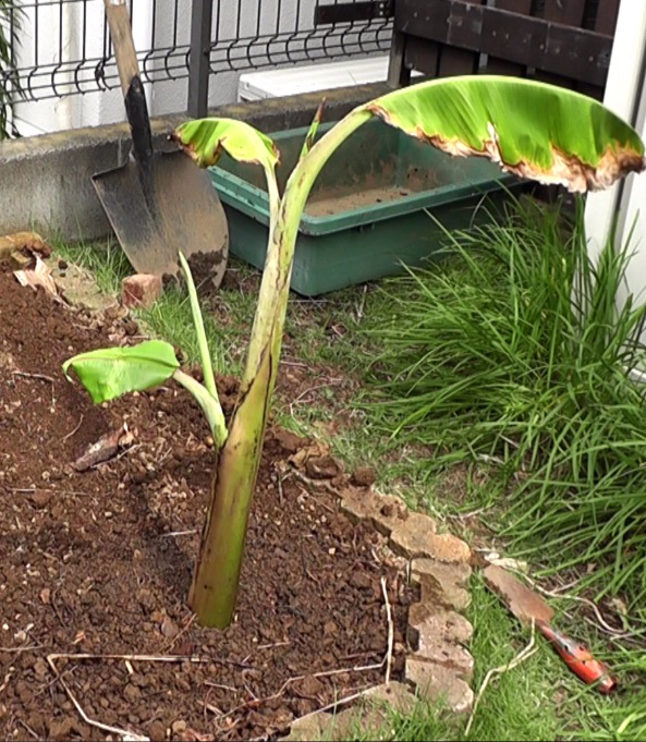 2.冬越ししたバナナを地植えと鉢植えに