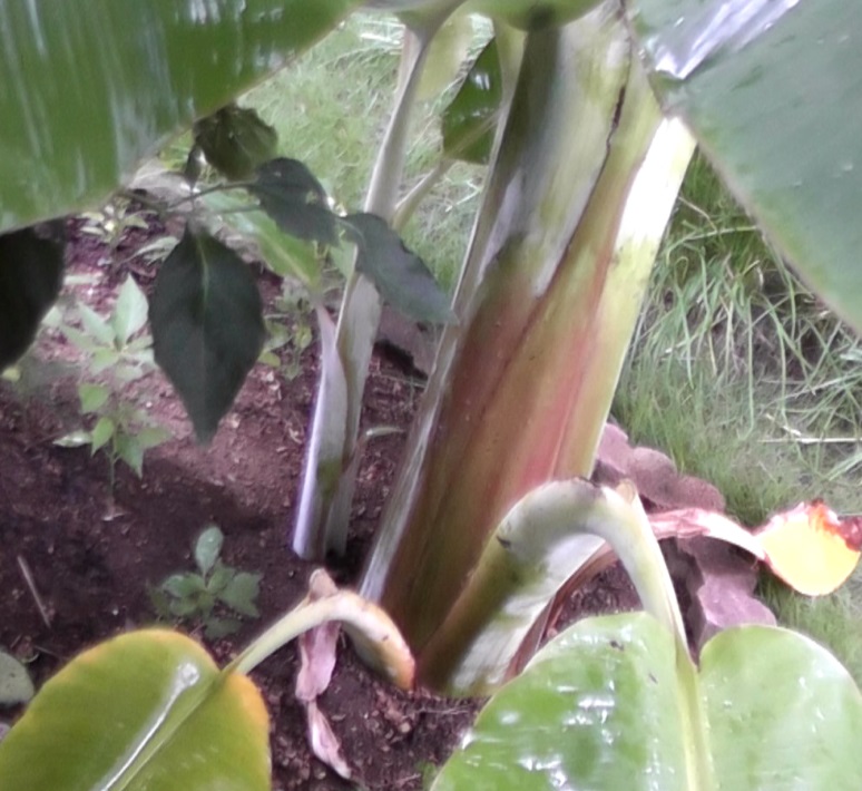 さて、今シーズンの2株のバナナ栽培は概ね終了しましたが、地植えで育てた三男には10月時点で写真のような1株の吸芽(長女)が生えてきていました。