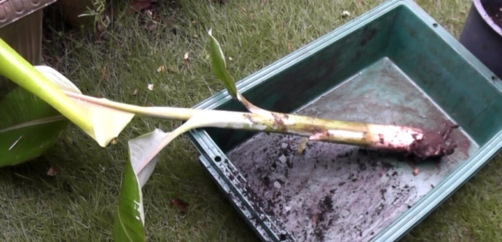 ちなみに、この株分け作業で土の中の膨らみ部分を痛めてしまうと、鉢に植え付けても枯れてしまうことは昨年の株分けで実証済です。”イモ”と呼ばれる膨らみ部分は絶対に傷めないように注意しながら、果物ナイフなどの刃渡りの短い刃物で親株から切り離しましょう。