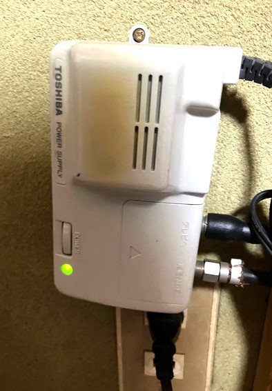 まず1点目は、地デジ放送の受信電波信号を増幅させるブースター用の電源が、テレビの使用頻度が低い「離れ」側に設置されていることです。(写真のような、ある意味レアな東芝製ブースターが設置されていました)
