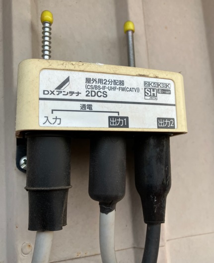 写真が実際に屋外に設置されている分配器ですが、”入力-出力1”が「通電可」のラインで、”入力-出力2”が「通電不可」のラインになります。