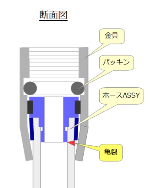 構造を確認してみると、水漏れが発生する原因としては、金具内でホースに発生する”亀裂”しか考えられなそうですね。(それ以外の箇所は水漏れが発生したとしても、その量はわずかになりそうです。)