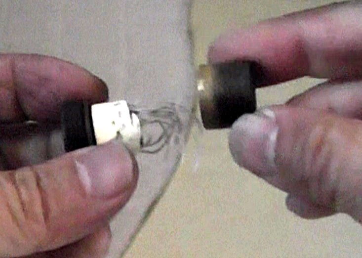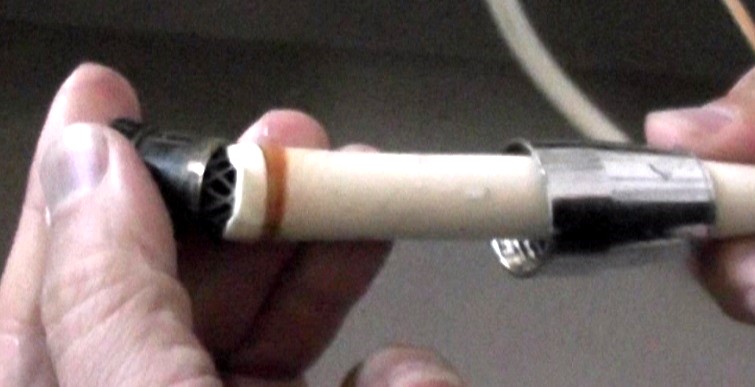まずは、構成する3部品を分解していきますが、部品どうしがかなり圧入される形で強固に組み付けられていますので、単純にホースを引っ張るだけでは分解できそうにありません。痛んでいるホースの先端部分だけをカッターでカットして、部品をホース本体と分離させてから、分解していくのが良さそうです。